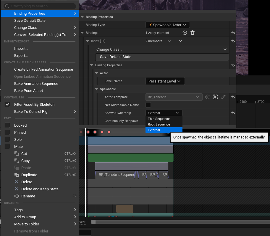 External로 설정하면 Spawn을 True로 활성화한 경우 시퀀스가 끝나도 해당 액터가 제거되지 않는다.